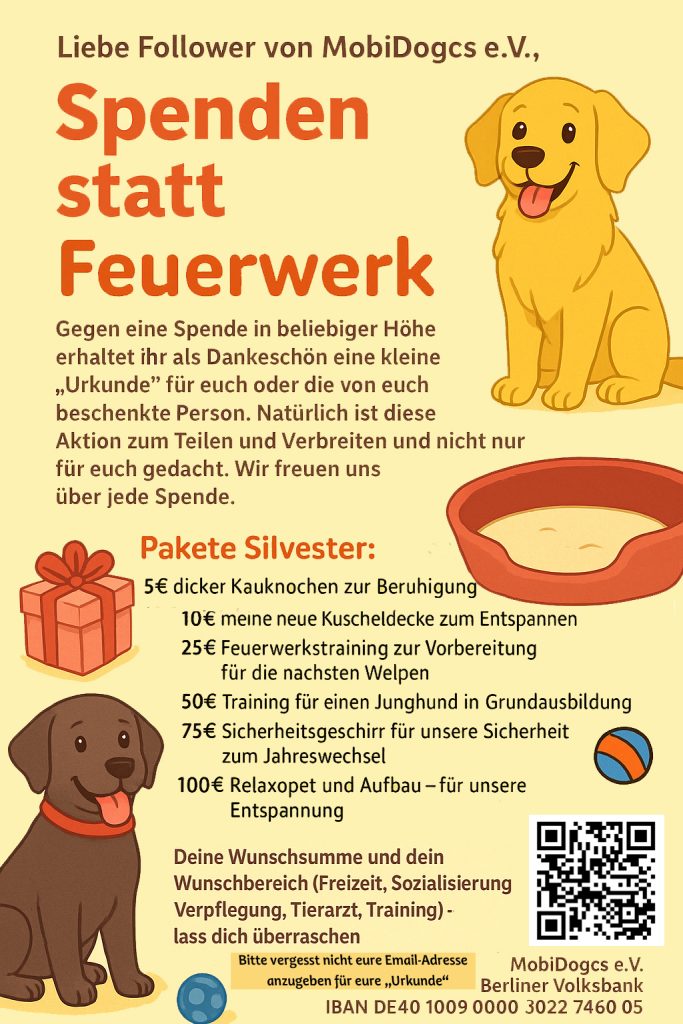 Alternativ zum Verwendungszweck schreibt uns den Namen des Kontoinhabers der Spende und alle wichtigen Daten via E-Mail an info@mobidogcs.de.